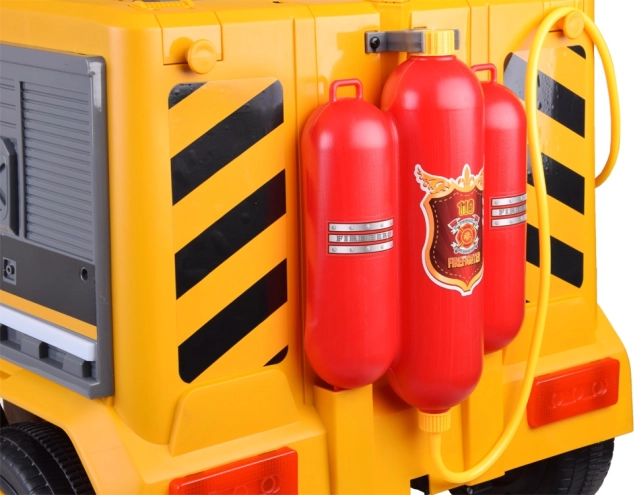 Het multimediapaneel biedt USB- en MP3-ingang, afspelen van ingebouwde muziek, lichtbediening en een schommelmodus (de auto beweegt automatisch korte stukjes voor-/achteruit). Op het stuur zitten knoppen voor claxon en muziekkeuze. Voor nog meer speelscenario’s is er een watertank met sproeier – kinderen kunnen “blussen”, de bouwplaats natspuiten of bloemen water geven.