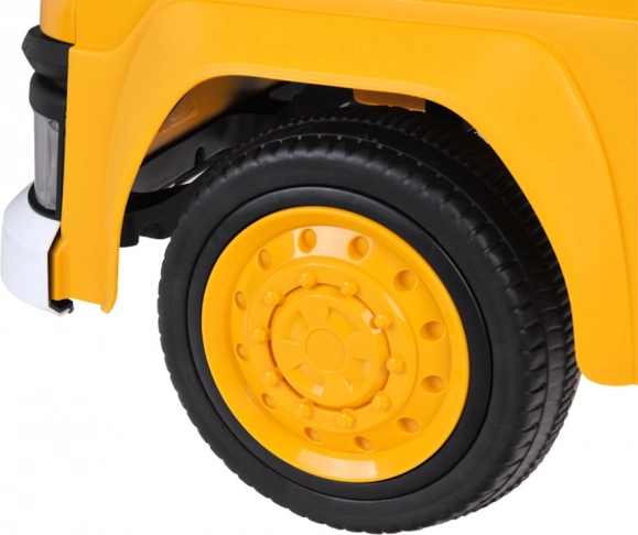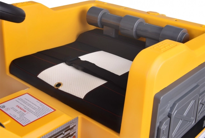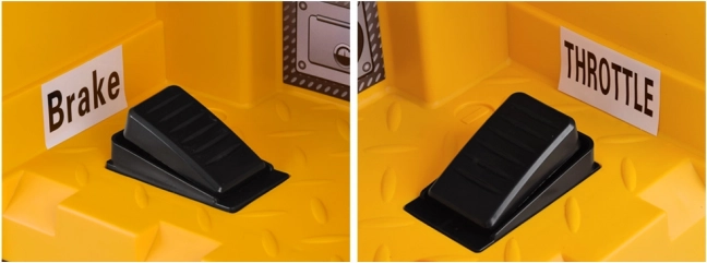 Ouders houden alles onder controle met de 2,4 GHz afstandsbediening met sturen, keuze uit 3 snelheden en een P – stop-knop voor direct remmen. De auto is gemaakt van hoogwaardig kunststof in typische gele bouwkleur, instappen zonder deuren is snel en gemakkelijk, de eco‑leren zitting met heupgordel en zachte EVA-wielen zorgen voor een comfortabele rit binnen en buiten.