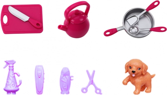 De set bevat kleine keukenhulpmiddelen en speelgoed voor het diertje voor nog gevarieerdere verhaaltjes en scènes uit het dagelijks leven.