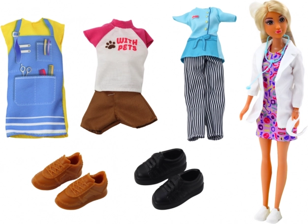 In de verpakking vind je meerdere outfits en schoenen, inclusief een schort en vrijetijdskleding – snelle transformatie naar kapster, kok of verzorger van huisdieren.