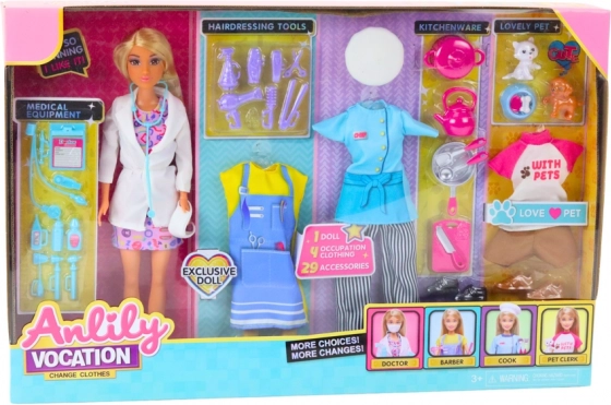 De ANLILY-pop met lang blond haar wordt geleverd met meerdere kledingsets en thematische accessoires, zodat ze in een oogwenk kan veranderen in een dokter, kapster, kok of dierenverzorger. Elke rol biedt andere speelscenario’s en ondersteunt de ontwikkeling van sociale vaardigheden en creativiteit.
