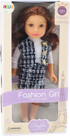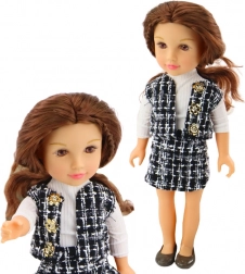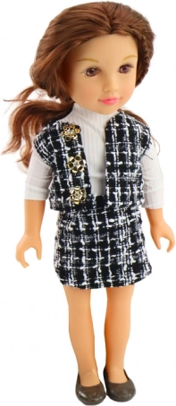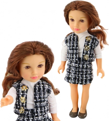 De pop pronkt met een elegante outfit bestaande uit een zwart-wit geruite rok en vest, die samen een unieke stijl creëren. Een witte blouse met lange mouwen completeert de look en geeft een klassieke touch.