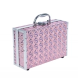 Roze koffer met getextureerd oppervlak, metalen handgreep en betrouwbare sluiting: ziet er geweldig uit en beschermt je cosmetica thuis en onderweg.