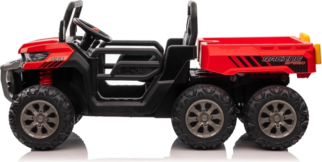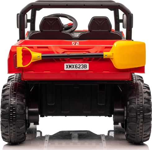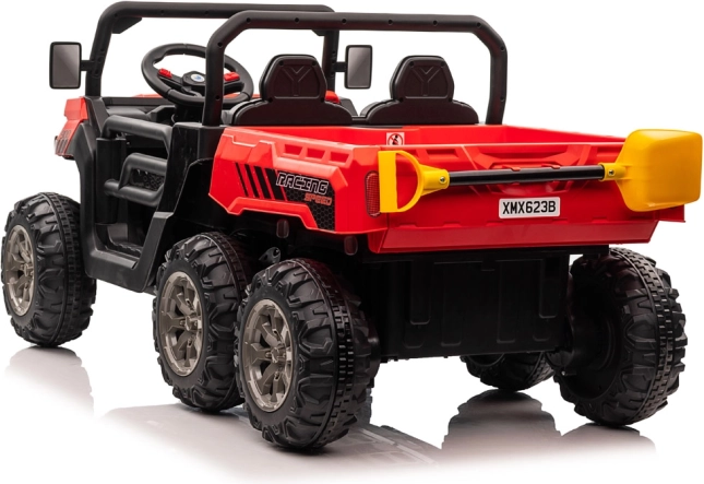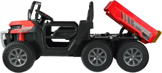 Robuuste elektrische kinderauto met 4x6-aandrijving, twee zitplaatsen en een elektrisch kiepbare laadbak voor kleine helpers. Voorzien van 4 krachtige 24V/75W motoren, zachte EVA-wielen, soepel wegrijden, vering, LED-verlichting en een ouderlijke 2,4 GHz afstandsbediening voor veilig rijden in de tuin en op het erf.