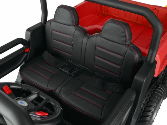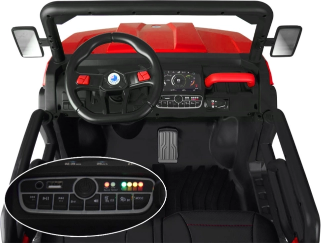 De jonge bestuurder zal de realistische cockpit waarderen met rijrichtingskeuze (D/P/R), het geluid van een startende motor, USB-ingang en het afspelen van melodieën. Ouders houden alles onder controle dankzij de 2,4 GHz afstandsbediening (vooruit/achteruit, links/rechts, snelheidskeuze en noodstop). Deuren met vergrendeling maken instappen eenvoudig en gordels verhogen de veiligheid.