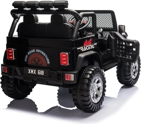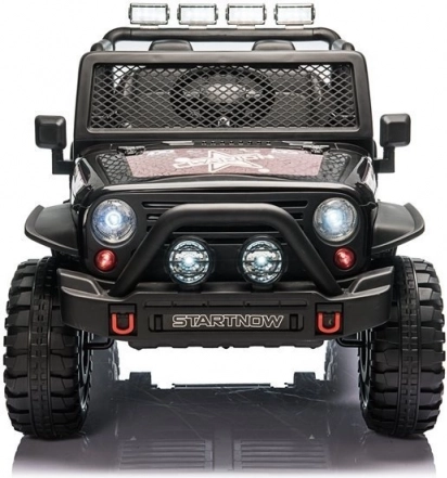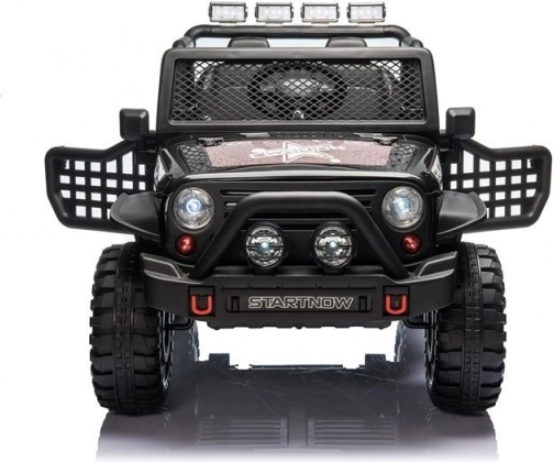 Ontdek een moderne elektrische kinderauto met een aantrekkelijke off-road look en opvallende elementen zoals massieve banden, een voorste beschermbumper en een lichtbalk. De zwarte uitvoering oogt zowel elegant als sportief en valt direct op.