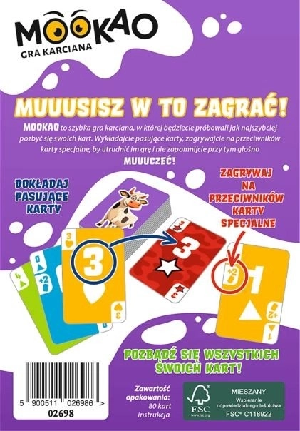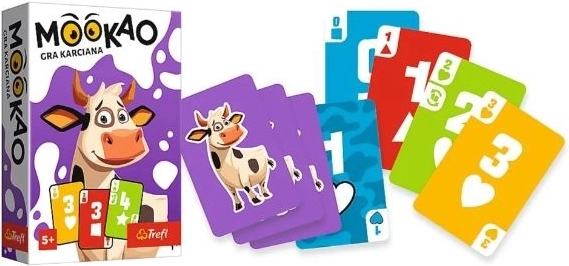 Een leuk en dynamisch kaartspel MooKao van Trefl, waarin het doel is om zo snel mogelijk al je kaarten uit je hand te spelen. Speel overeenkomende kaarten, gebruik speciale effecten tegen je tegenstanders en vergeet niet om daarbij lekker te loeien – lachen en spanning gegarandeerd!