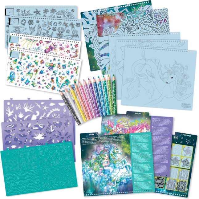 - 250 stickers, 12 kleurpotloden, 80 sjablonen, 35 vellen met afbeeldingen, 4 plastic vormpjes, instructies voor 12 tekentechnieken