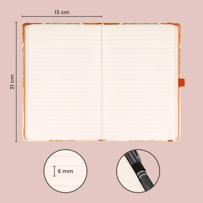 Elegant gelinieerd notitieboek met motief Alfons Mucha – Schilderkunst in harde kaft, met praktische elastische sluiting, pennenlus en binnenvak. Binnenin vind je 172 pagina’s op aangenaam geel papier, ideaal voor aantekeningen, dagboek en werkideeën.