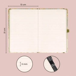 Het binnenvak biedt plaats aan kleinigheden, visitekaartjes of stickers. Geel papier met dotted structuur biedt veelzijdig gebruik – van notities en schetsen tot bullet journaling. De lijnen zorgen voor overzicht en comfortabel schrijven thuis, op kantoor en onderweg.