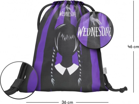 Lichte en praktische gymtas met het iconische Wednesday-motief die perfect past bij elke vrijetijdsoutfit. Dankzij het duurzame, makkelijk te onderhouden materiaal is hij geschikt voor dagelijks gebruik – naar school, de gymzaal en op uitstapjes.