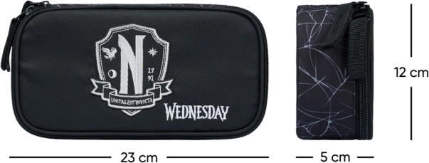 De zwarte etui met embleem en het opschrift Wednesday valt op door zijn originele look en zorgvuldige details die je stijl op school en onderweg onderstrepen.