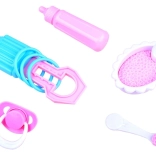 De set bevat praktische accessoires: een kommetje met pap, een lepeltje, een speen, een flesje en een rammelaar. Kinderen kunnen hun baby voeren, troosten en in slaap helpen.