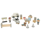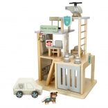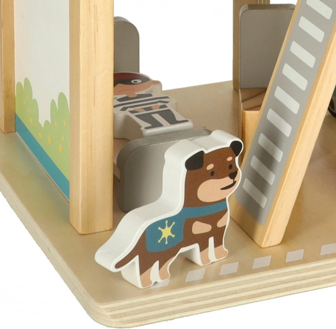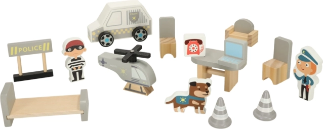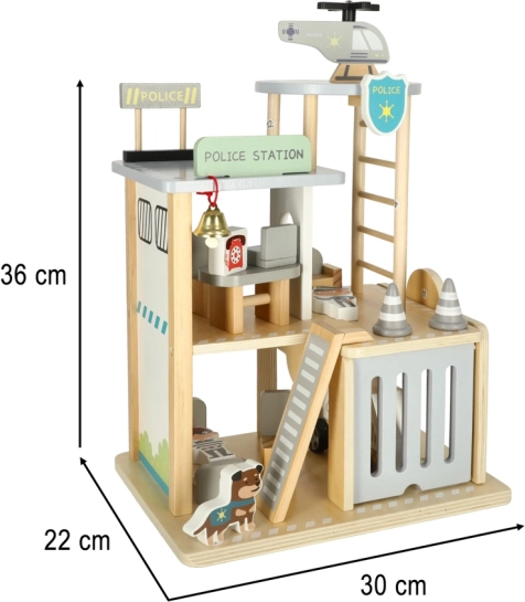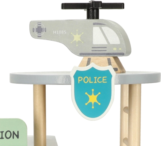 Deze doordachte houten set neemt kinderen mee in de wereld van reddingsacties. Op de begane grond is er een garage voor de politieauto en een cel voor de dief, in het midden een kantoor van de chef en op het dak een heliport voor snelle uitrukken. Het glad afgewerkte hout zorgt voor veilige hantering en een lange levensduur van het speelgoed.