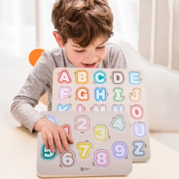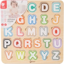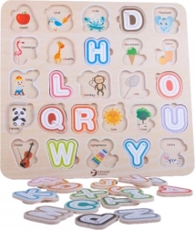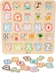 Een leuke en tegelijk leerzame game voor de allerkleinsten: een kleurrijke houten inlegpuzzel met het alfabet ontwikkelt de fijne motoriek, logisch denken en het herkennen van letters. Onder elke letter zit een afbeelding in het Engels, zodat kinderen op natuurlijke wijze al op jonge leeftijd de basis van het Engels meekrijgen.