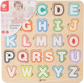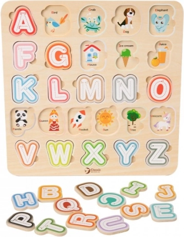 Dit hoogwaardige houten alfabet met afmeting 30 × 30 cm ondersteunt de eerste stapjes richting lezen en schrijven. Kinderen plaatsen de kleurrijke, uitneembare stukjes in de corresponderende vormen en trainen zo oog-handcoördinatie en ruimtelijk inzicht. Dankzij de afbeeldingen onder de letters maken ze spelenderwijs kennis met Engelse woordjes.