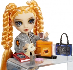 De pop RAINBOW HIGH Sparkle & Shine Clementine brengt een opvallende oranje look, een denim jasje, een rok met ruitpatroon en plateauzolen met de tekst RAINBOW. Inclusief standaard, kam en thematische accessoires met koffiemotief die het speelplezier en de verhalen uitbreiden.