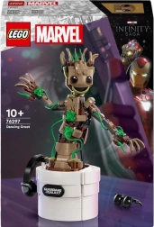 LEGO Marvel Dansende GROOT (76297) is een originele bouwset die creatief bouwen combineert met een interactieve dansfunctie. Draai aan de hendel aan de achterkant van de bloempot en kijk hoe GROOT begint te dansen. Dankzij de articuleerbare kop en armen kun je de figuur eenvoudig in verschillende poses zetten en zo leuke scènes uit het MARVEL-universum creëren.