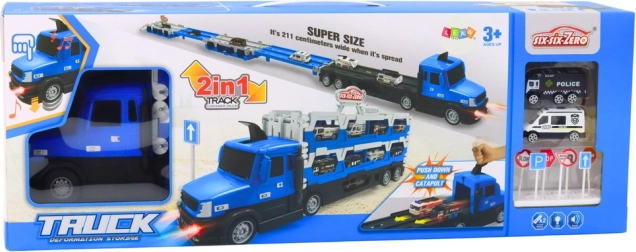 Ontdek de leuke 2-in-1 set: een robuuste blauwe transportvrachtwagen die, eenmaal uitgeklapt, verandert in een lange racebaan. Dankzij licht- en geluidseffecten, politieautootjes op schaal 1:64 en een set verkeersborden wachten kinderen uren aan creatieve spelletjes en actievolle races.
