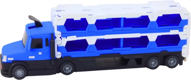 Deze multifunctionele vrachtwagen in aantrekkelijk blauw combineert een autotransporter en een 2-in-1 racebaan. Uitgeklapt krijg je een baan tot wel 211 cm lang, ideaal voor dynamische duels en het oefenen van rijvaardigheden. Realistische lichten en geluiden versterken de sfeer van echte races.