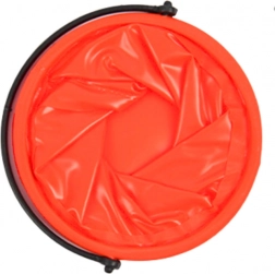 De oranje opvouwbare emmer kan eenvoudig tot een platte vorm worden gevouwen, wat het makkelijk maakt om op te bergen en te vervoeren.