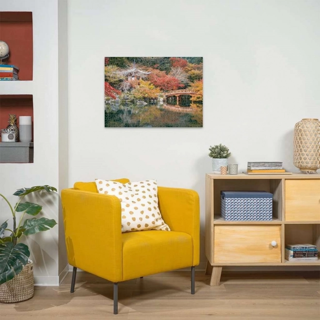 Het herfstpalet van rode en oranje tinten met een traditionele brug en tempel creëert een motief dat met plezier wordt gelegd en een ontspannend effect heeft.