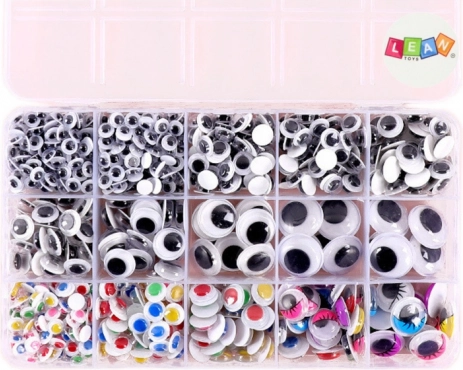 Alle oogjes zijn netjes geordend in een praktische organizer met 15 vakjes, die helpt om knutselmaterialen op orde te houden.