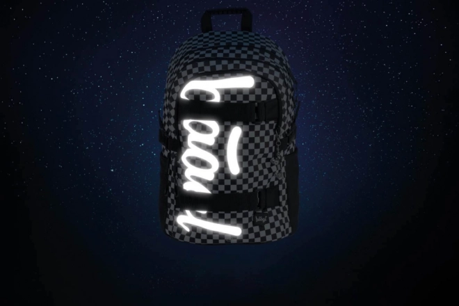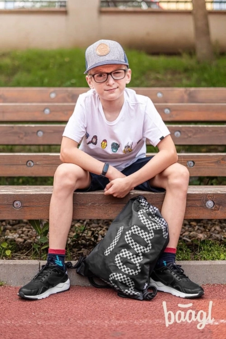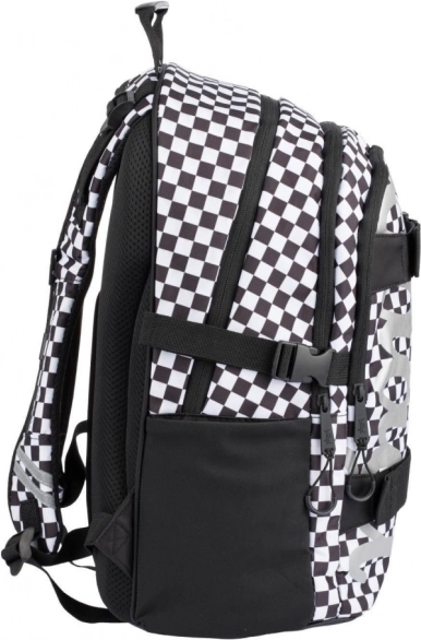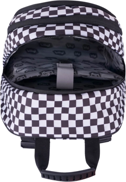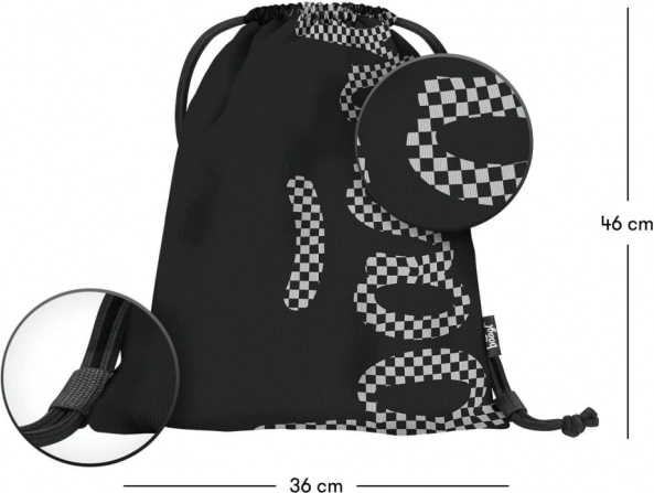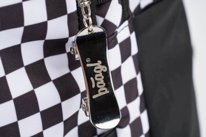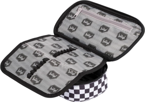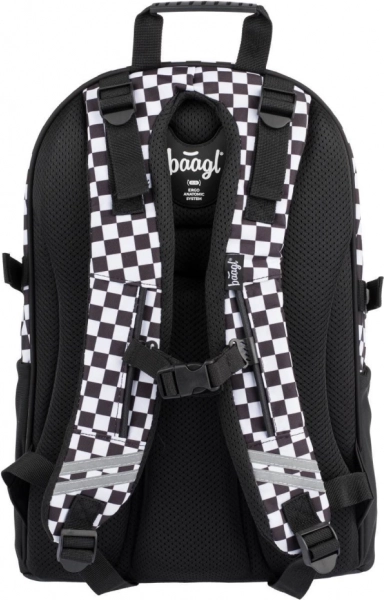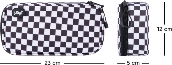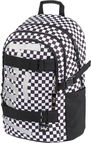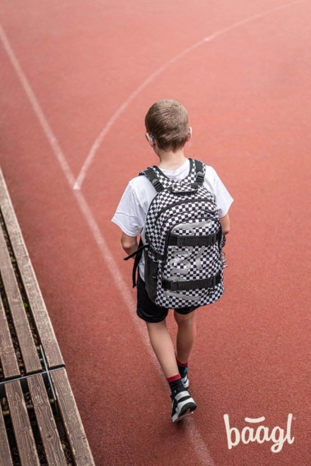 Stijlvolle BAAGL schoolsset met een zwart-wit geruit motief, bestaande uit een ruime rugzak, een praktisch etui en een lichte gymsack. De rugzak biedt ergonomisch gevormde rugpadding, 3 compartimenten met organizer, een vak voor een 15'' laptop en riemen voor een skateboard. Dankzij reflecterende elementen, waterafstotend materiaal en een gewicht van slechts 850 g is hij ideaal voor school en naschoolse activiteiten.