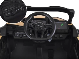 De kleine bestuurder geniet van lichteffecten (LED voor en achter), motorgeluid bij het starten en ingebouwde melodieën. Op het dashboard bevindt zich een multimediapaneel met USB en MP3, een batterijstatusindicator, keuze snel/langzaam, rijden vooruit/achteruit, een schakelaar 2x2/4x4 en een schakelaar handmatig/afstandsbediening. Ouders beschikken over een 2,4 GHz afstandsbediening met versnelling in 3 niveaus en een veiligheidsknop Stop.