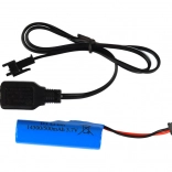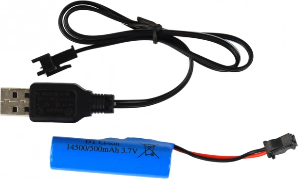 Inclusief Li‑ion accu 3,7 V 500 mAh en USB‑lader. Opladen tot 2 uur, rijtijd tot 30 minuten per lading.