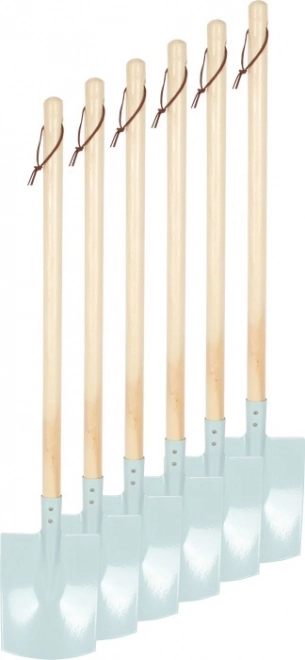 Lichte en duurzame kinderschop in een aantrekkelijke lichtblauwe kleur van het merk small foot, ideaal voor kleine tuiniers. Heeft een ergonomisch afgestemd gewicht en vorm, een metalen blad en een houten steel, wat zorgt voor comfortabel en veilig gebruik. De praktische ophangkoord maakt opbergen eenvoudig.