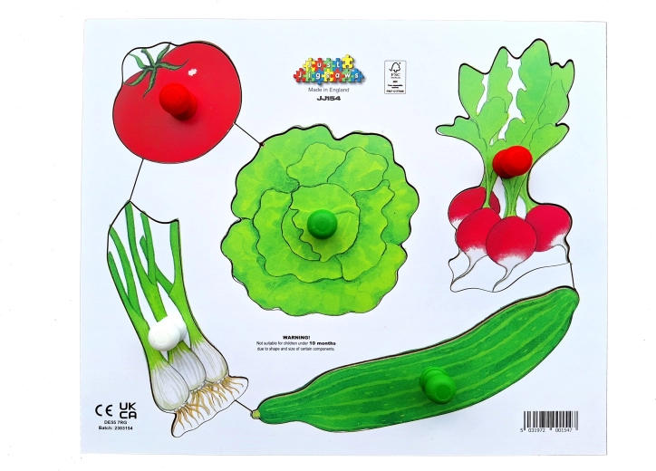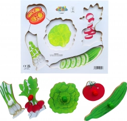 Deze houten puzzel biedt kinderen de mogelijkheid om verschillende soorten groenten te leren herkennen. Stokjes op de puzzels zorgen voor gemakkelijk vastpakken en hanteren.