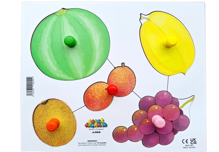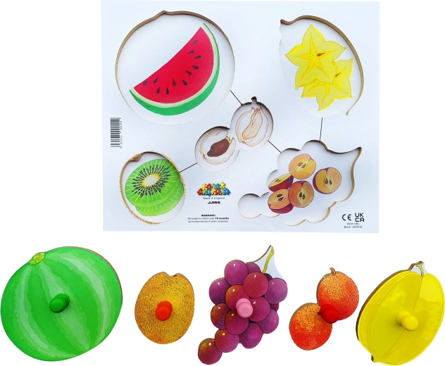 Deze houten puzzel is ontworpen om kinderen te helpen begrijpen en herkennen hoe exotisch fruit er niet alleen aan de buitenkant, maar ook van binnen uitziet. Elk stuk heeft een pinnetje voor gemakkelijke grip, wat zorgt voor comfortabeler hanteren door kleine handjes. Kinderen hebben de taak om de verschillende fruitsoorten aan de juiste gesneden varianten te koppelen, wat een geweldige manier is om hun namen, kleuren en vormen te leren.<262F>