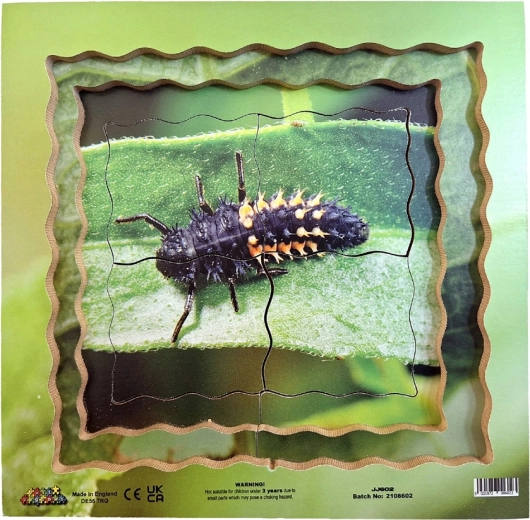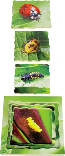 Ontdek een ongewone educatieve puzzel die zowel kinderen als volwassenen boeit. Deze gelaagde puzzel bevat vier fasen van de ontwikkelingscyclus van het lieveheersbeestje: eieren, larve, pop en volwassen lieveheersbeestje, een geweldige manier om de natuur spelenderwijs te verkennen.