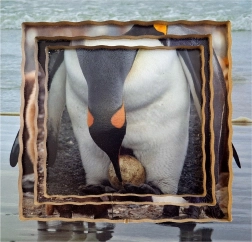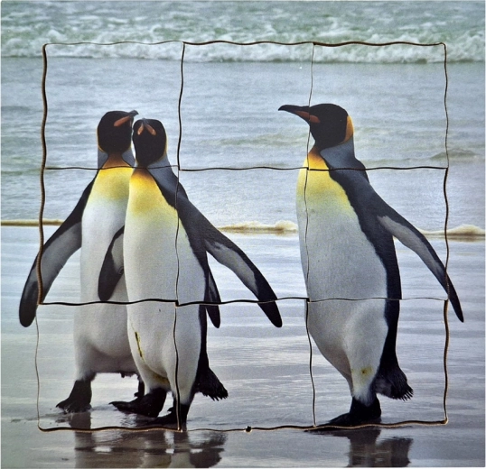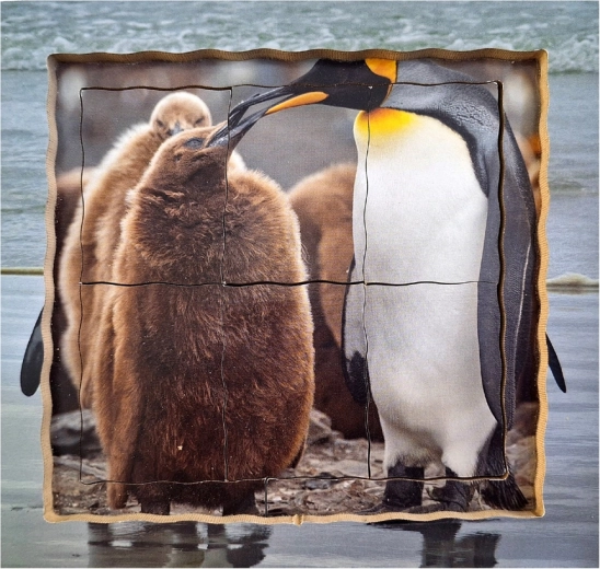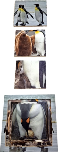 - Ontwikkelingsfasen: De puzzel toont eieren met een ouder, een pas uitgekomen kuiken, een ouder kuiken tijdens het voeren en volwassen pinguïns.