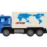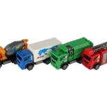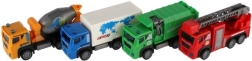 Kies uit vier types vrachtwagens, waaronder een betonmixer, vuilniswagen, brandweerauto en transportvoertuig.