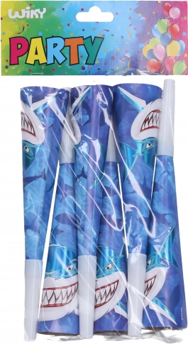 Feesttoeters met haaienmotief, lengte 20 cm. Verpakking met 6 stuks voor kinderfeesten en themafeesten. Eenvoudig in gebruik en zorgt voor een geweldige sfeer.