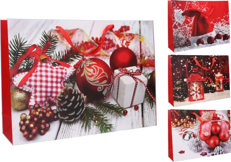 U kunt kiezen uit aantrekkelijke motieven met kerstornamenten, lantaarns en winterdecoratie die de feestelijke sfeer benadrukken. De tas is herbruikbaar en biedt een snelle, esthetische en milieuvriendelijkere manier van inpakken zonder te hoeven plakken en papier knippen.