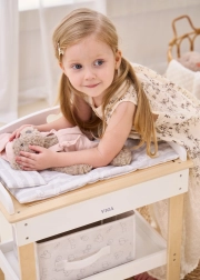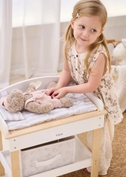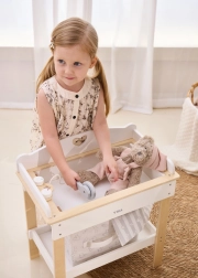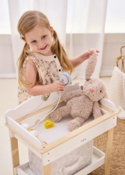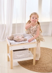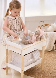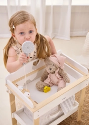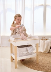 De robuuste houten constructie garandeert veilig en stabiel spelen. Minimalistische natuurlijke en witte tinten passen moeiteloos in een modern interieur. De set is perfect voor rollenspel en stimuleert fijne motoriek, empathie en verantwoordelijkheidsgevoel bij de zorg voor poppen tot 43 cm.