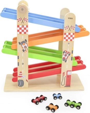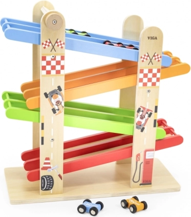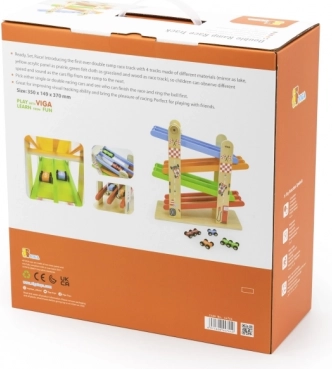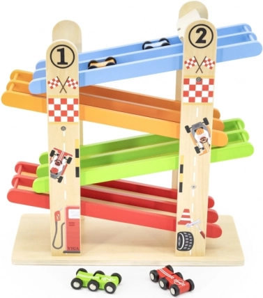 De leuke houten racebaan met dubbele baan van Viga biedt kinderen eindeloze races en plezier in beweging. Twee parallelle banen maken duelraces met twee autootjes tegelijk mogelijk, met aan het einde belletjes bij de finish. De stevige constructie van gelakt hout, zonder scherpe randen en met niet-giftige verven, is veilig voor kleine handjes. Inclusief 4 kleurrijke autootjes in twee uitvoeringen (4-wielig en 6-wielig) die motoriek, oog-handcoördinatie stimuleren en spelenderwijs kennis laten maken met natuurkundige principes.