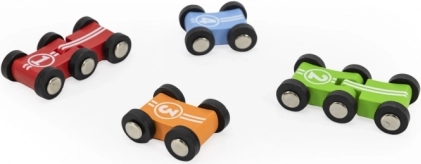 In de set vind je vier kleurrijke autootjes met startnummers, in twee types – twee vierwielers en twee zeswielers – voor extra variatie in het rijden. Het spel stimuleert op natuurlijke wijze logisch denken, fijne motoriek, oog-handcoördinatie, het leren van kleuren en cijfers, en sociale vaardigheden bij het wedijveren (winnen/verliezen).