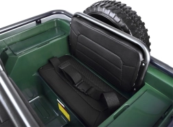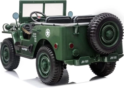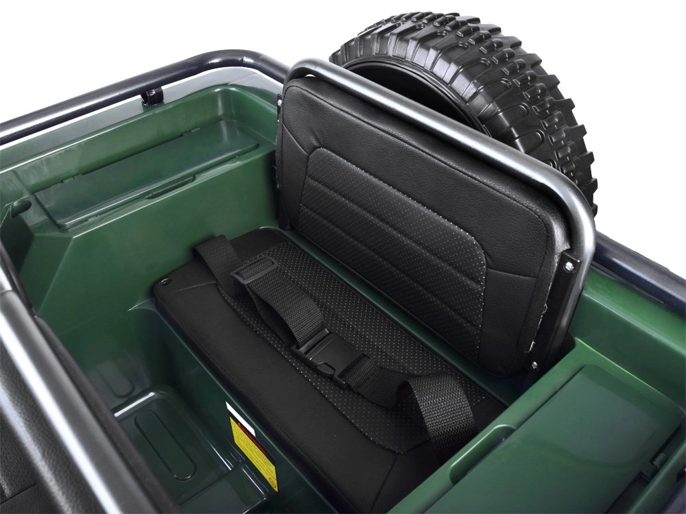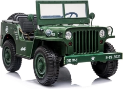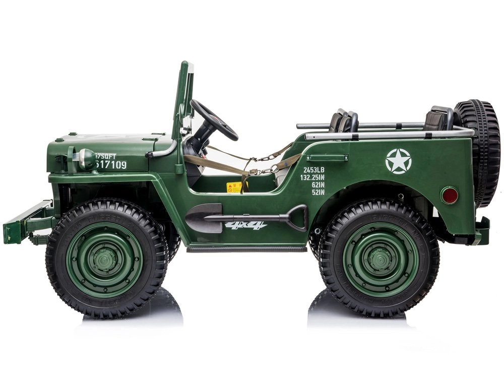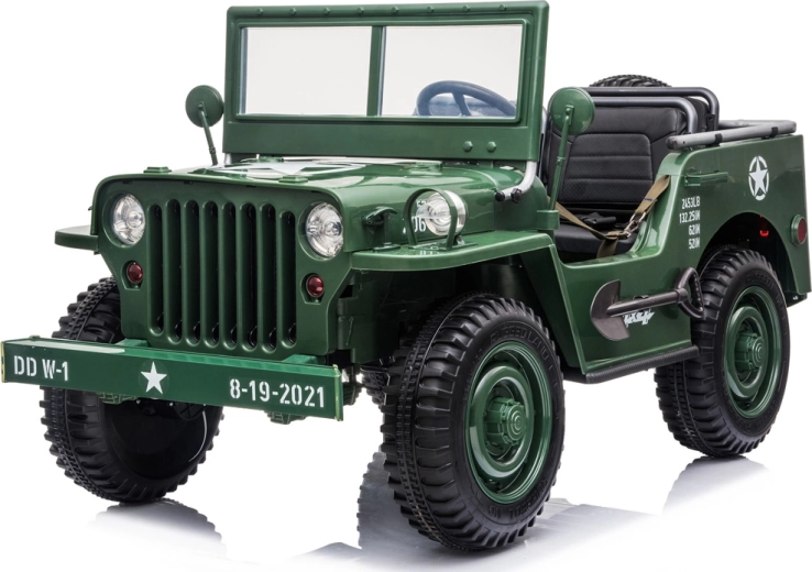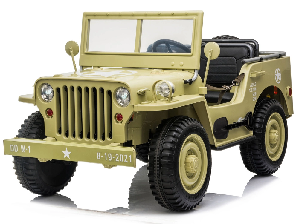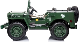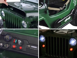 Robuuste elektrische kinderauto in militaire stijl van de JEEP WILLYS voor drie kinderen, met 4x4-aandrijving met schakeloptie naar 2x2, krachtige 4× 12 V 45 W motoren, een grote gel-accu 12 V 14 Ah en 2,4 GHz afstandsbediening voor ouders. Het autootje verrast met werkende verlichting, geluidseffecten, een neerklapbare voorruit, brede zitplaatsen met veiligheidsgordels en grote EVA-wielen voor comfortabel rijden.