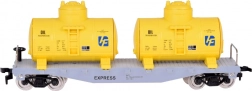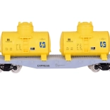 Platte wagon met twee gele tanken en een aparte zilveren CHEMICAL-tank. Draaibare assen zorgen voor soepel nemen van bochten.