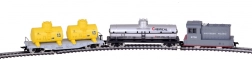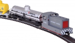 - SOUTHERN PACIFIC-locomotief, platte wagon met 2 tanks, CHEMICAL-tank, besturingsunit, voeding, verbindingskabel, bochten 30° (11 stuks), voedingsbocht, oprijhulp