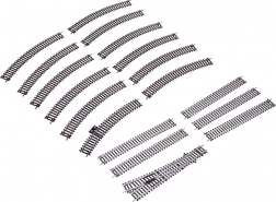 De set bevat rechte rails, bogen en wissels, zodat u direct een werkende baan kunt opbouwen of uw bestaande spoorweg kunt uitbreiden.