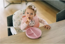 Siliconen bordje in roze kleur met drie vakken is de ideale keuze voor kinderen en peuters. Het is gemaakt van hoogwaardig siliconen, dat gemakkelijk schoon te maken en duurzaam is.