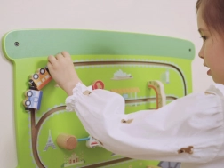 De interactieve muurtrein verandert elke kamer in een speels leercentrum. Drie losse panelen zijn eenvoudig aan de muur te monteren en besparen ruimte, terwijl de levendige kleuren en tactiele elementen uitnodigen om te ontdekken. Kinderen oefenen grijpen, oog-handcoördinatie en het begrip van oorzaak en gevolg, en dat alles veilig dankzij de precieze houten afwerking en niet-giftige verven.
