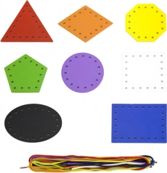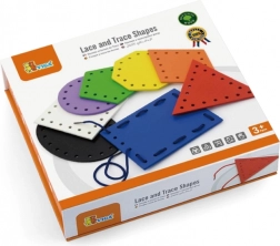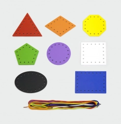 Acht gekleurde vormen en acht veters stimuleren sorteren, koppelen en benoemen. Kinderen leren kleuren en geometrische vormen op een leuke manier.