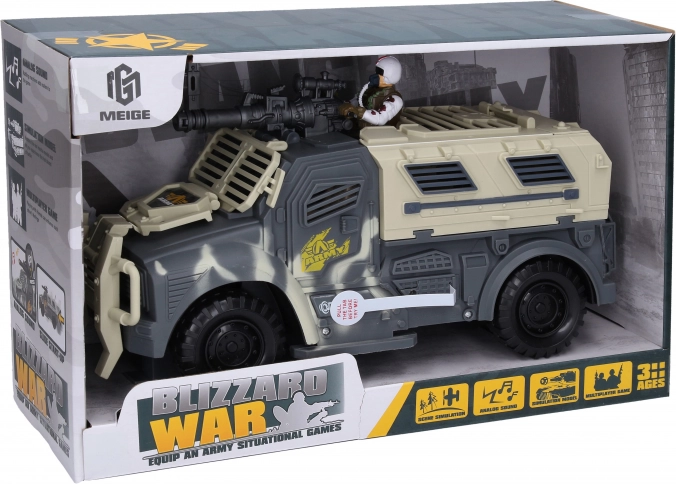 Dit militaire voertuig is ideaal voor kinderen die houden van actiespellen en militaire thema's. De auto, met een grootte van 31 cm, is uitgerust met geluids- en lichteffecten die je activeert met een knop aan de linkerkant van de auto. Dankzij de vrije wielen beweegt de auto gemakkelijk en natuurlijk. Het militaire voertuig wordt aangedreven door drie AG13-batterijen, die bij de verpakking zijn inbegrepen.