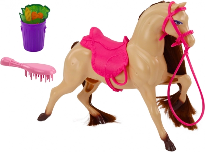 Paard met realistische details en beweegbare elementen. Inclusief roze zadel en hoofdstel met leidsels voor authentiek spelen.